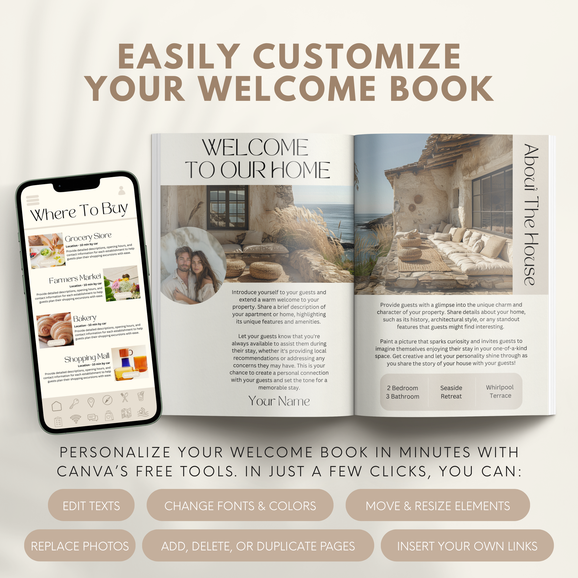 24-Page Printable Welcome Book – Elegant design in US Letter & A4 formats, perfect for in-property display or PDF sharing.