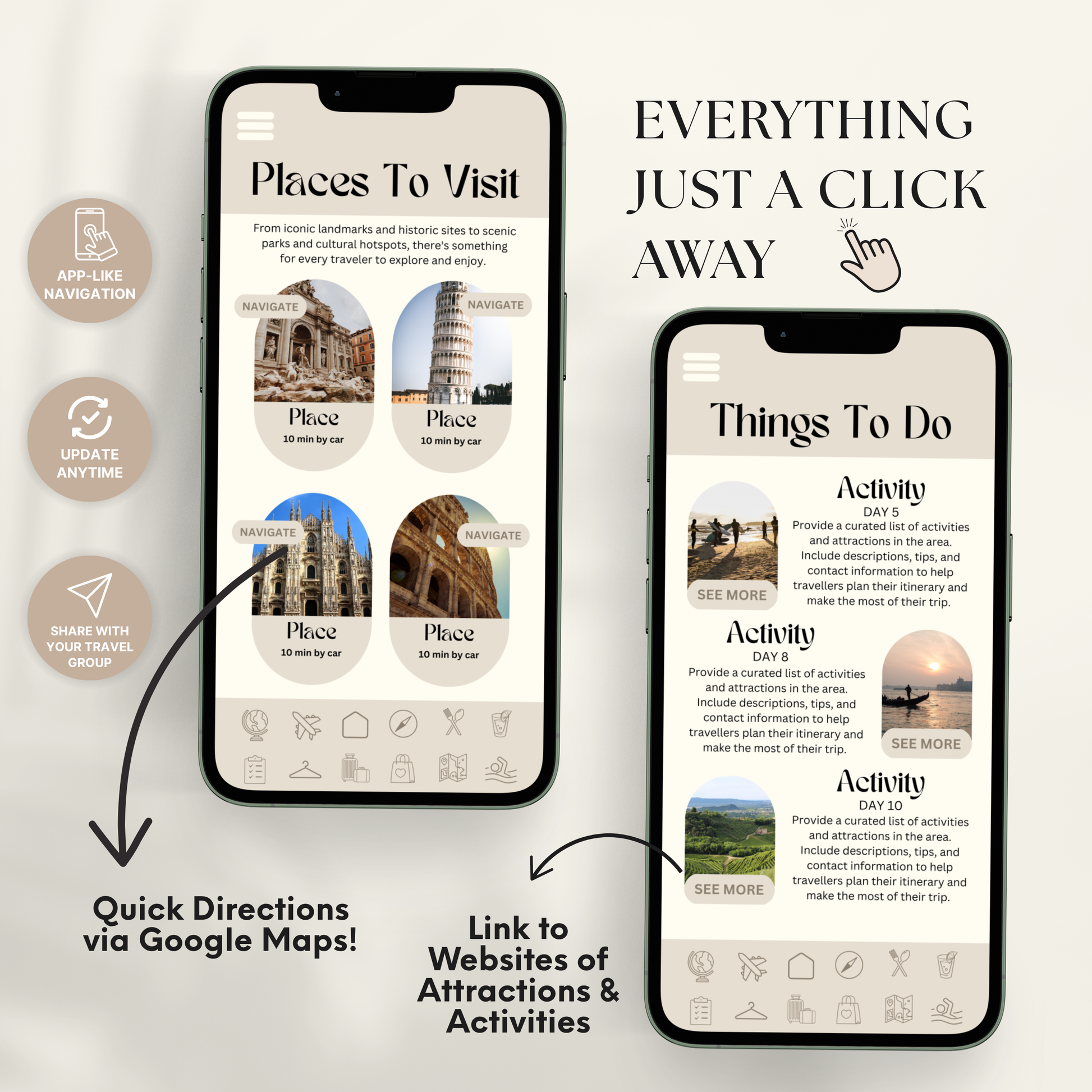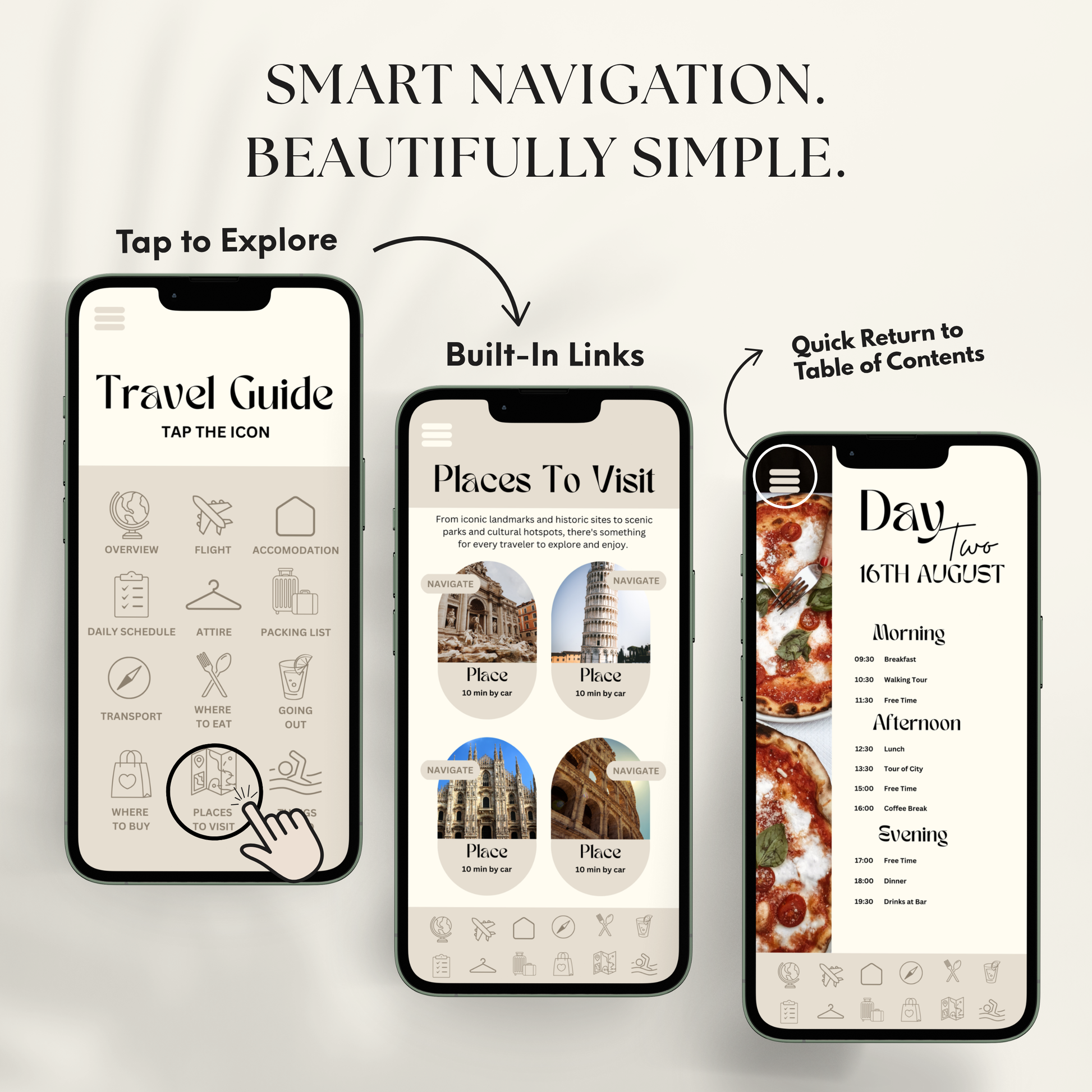 Enjoy a sleek, app-style itinerary with our interactive digital PDF, designed for smooth, intuitive use on any device.