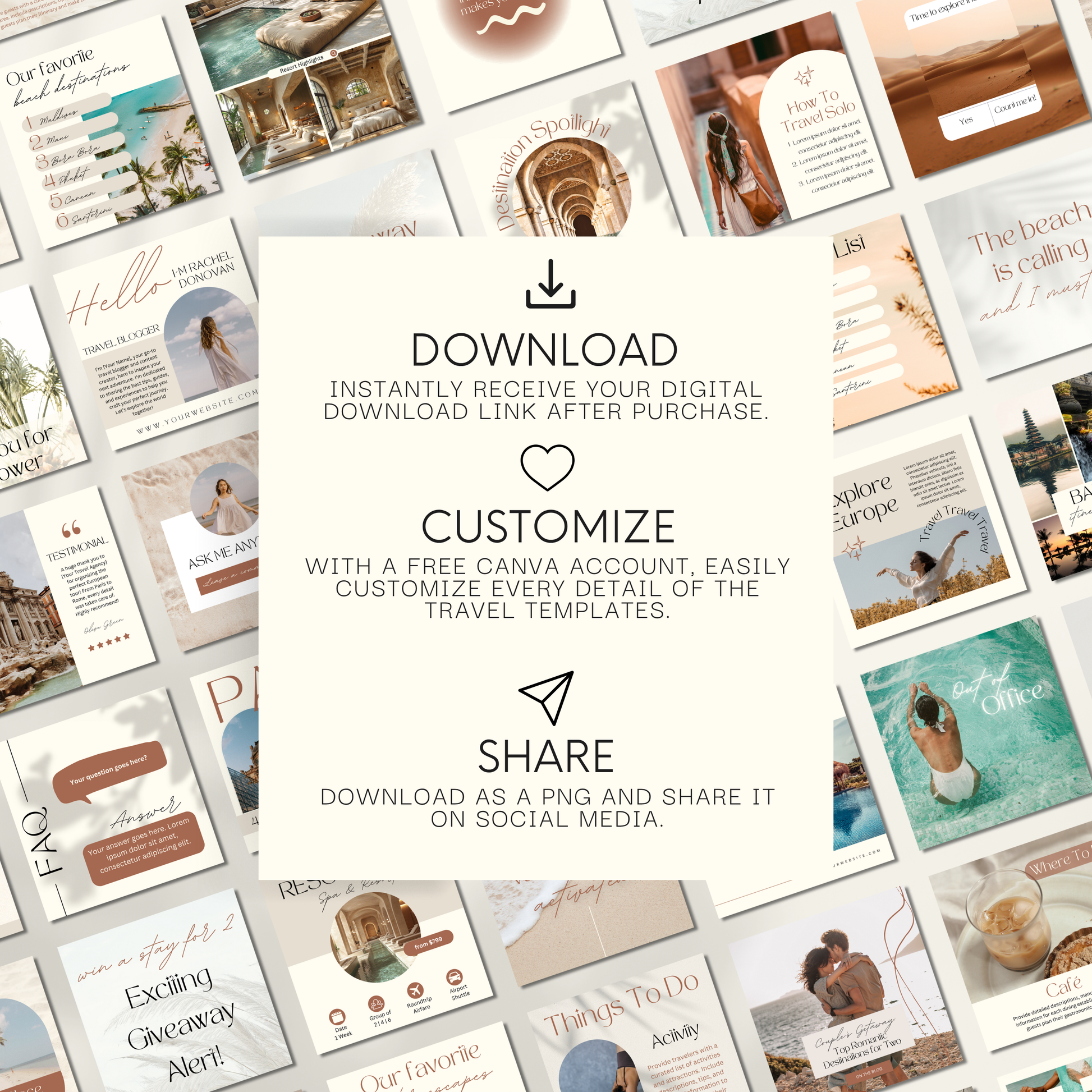 Transform your travel brand’s Instagram with this all-in-one, professionally designed Canva template bundle, perfect for travel bloggers, travel agents, and vacation content creators. From stunning destinations to client spotlights, this pack gives you everything you need to create a polished, high-converting Instagram presence that stands out in the travel space.