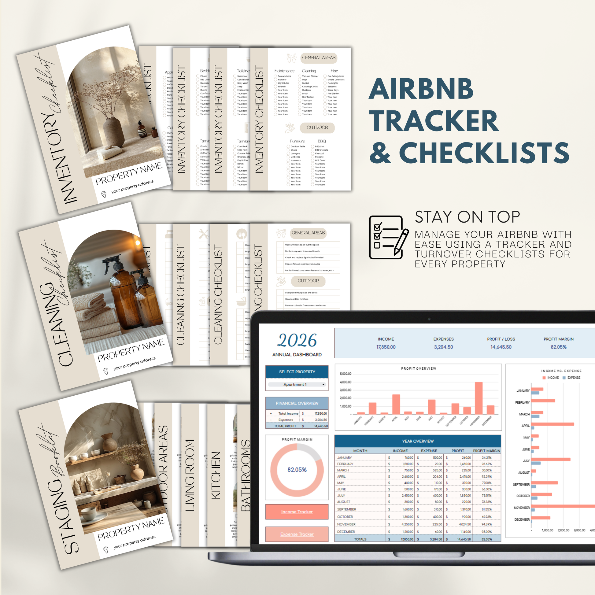 Includes a 5-page Cleaning Checklist, Inventory Checklist, and 8-page Staging Booklet, everything you need to manage your rental with ease.